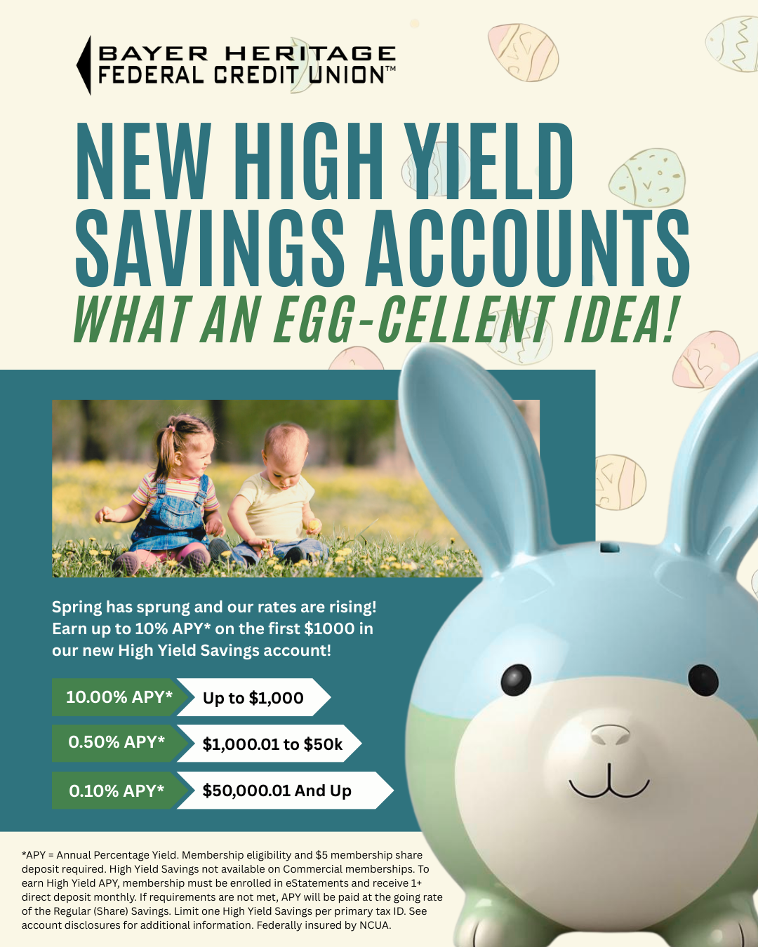 Earn up to 10% APY* on the first $1,000 in our new High-Yield Savings account! Best of all, you can open and fund your new High Yield Savings Account on our mobile app or in online banking by using the "Open New Share" feature. You can also stop by any branch, call 800-272-6003, or send us a message in mobile banking to set yours up today! See all the details below.