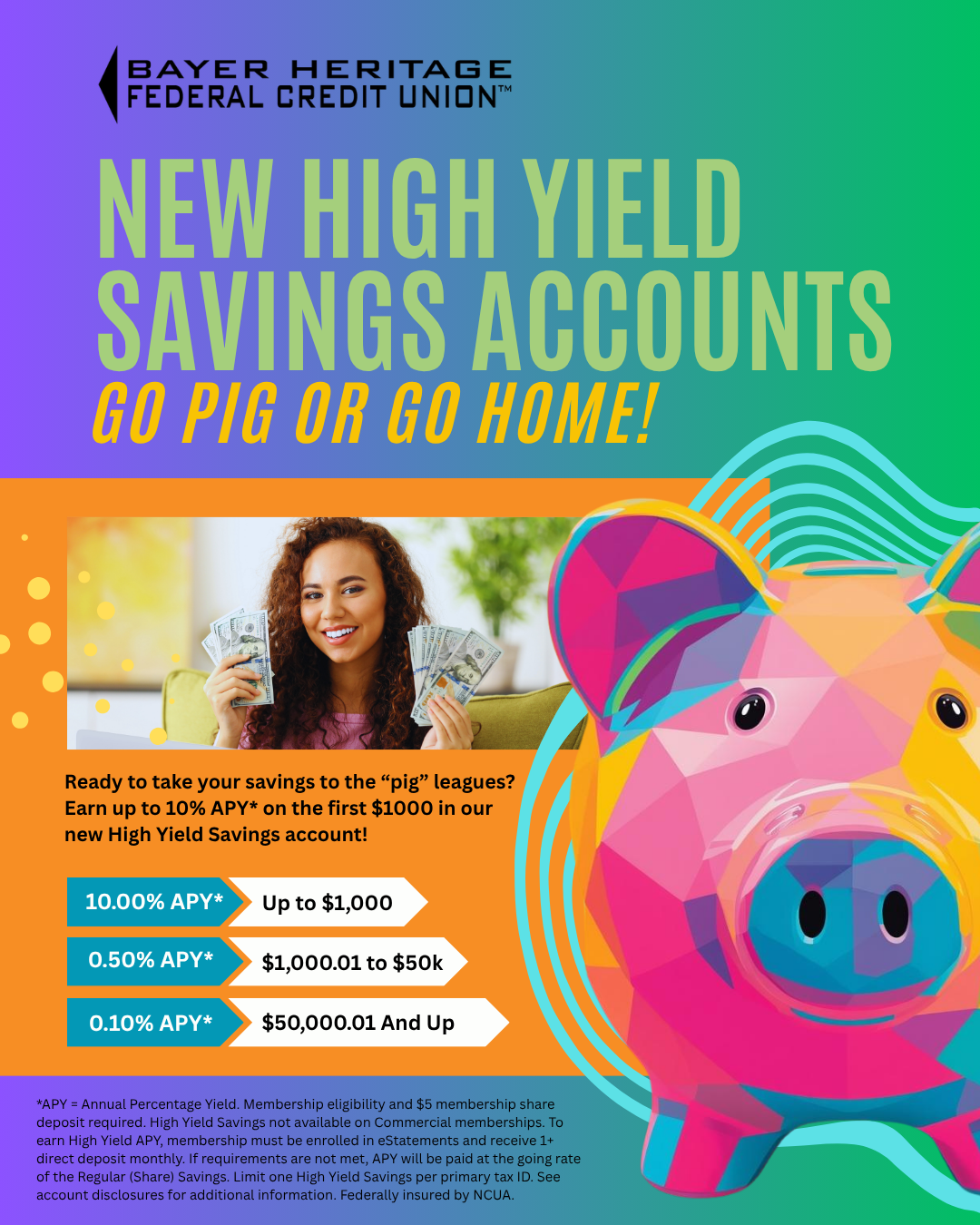 Earn up to 10% APY* on the first $1,000 in our new High-Yield Savings account! Best of all, you can open and fund your new High Yield Savings Account on our mobile app or in online banking by using the "Open New Share" feature. You can also stop by any branch, call 800-272-6003, or send us a message in mobile banking to set yours up today! See all the details below.